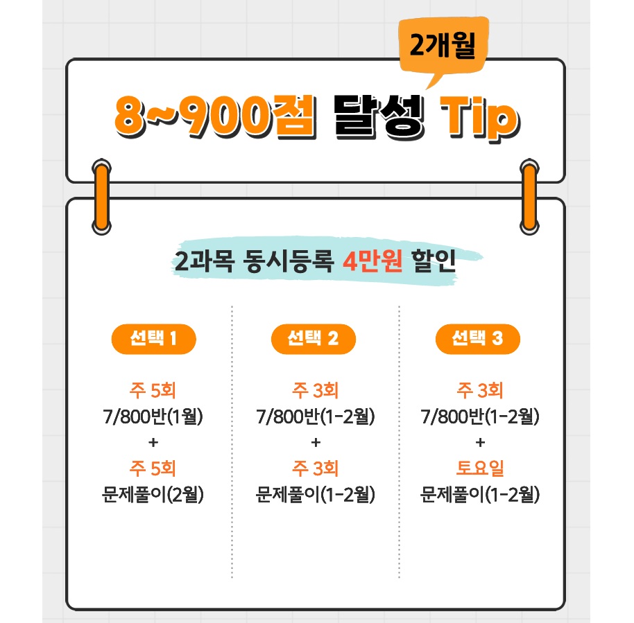 그러나 매일 학원에 나올수 있는 여건이 안된다면, 주3회(금격주) 두달과정으로 700/800반과 문제풀이반을 동시에 수강하는 방법도 있습니다.